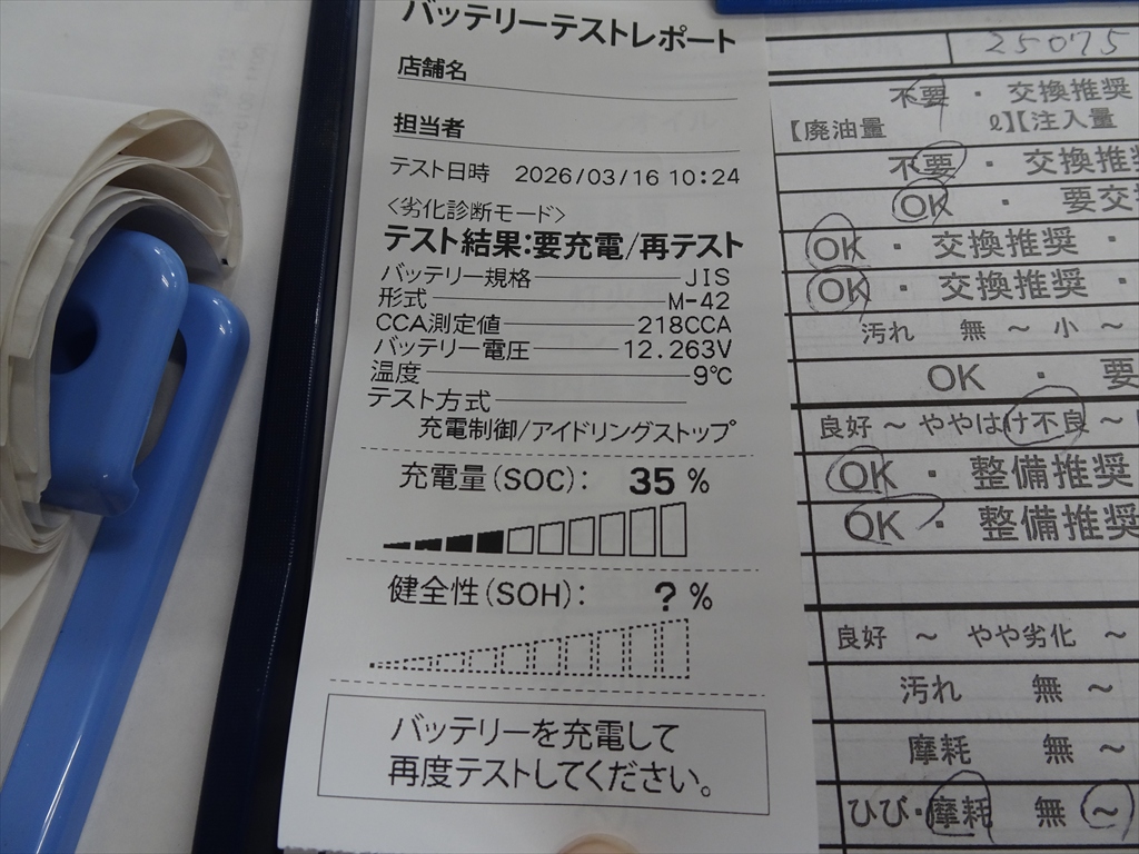 バッテリーの点検を実施したところ、バッテリーの劣化が進んでおりました。