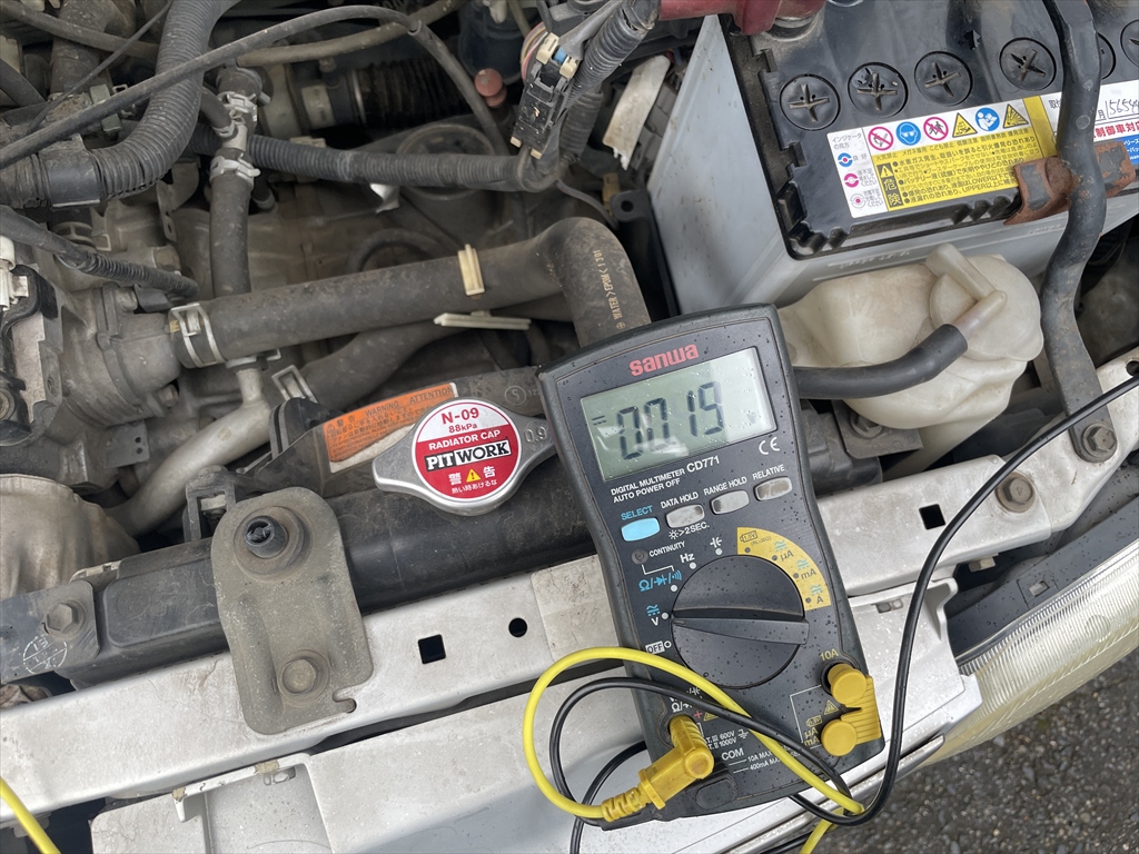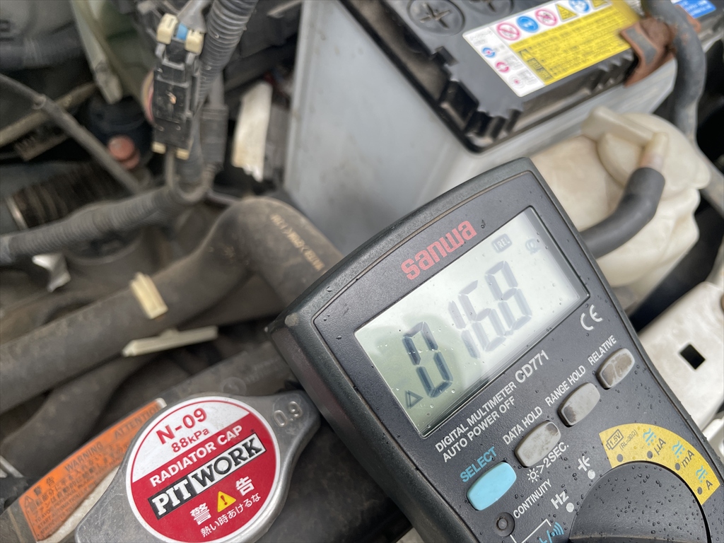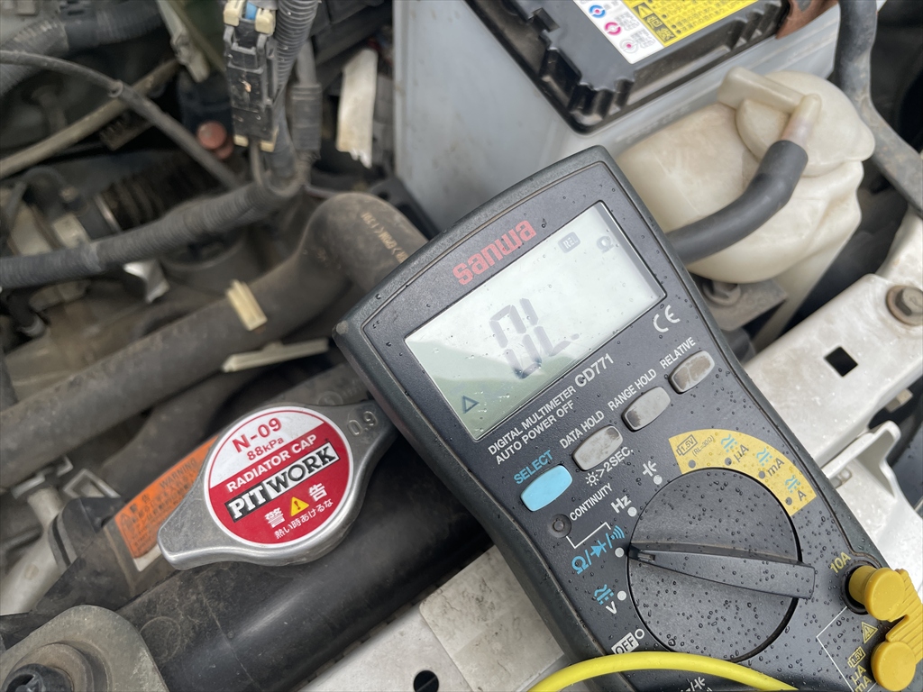 インジェクター(アース側)の電圧を点検すると、正常時は電源電圧よりも少し低い数値となります。
